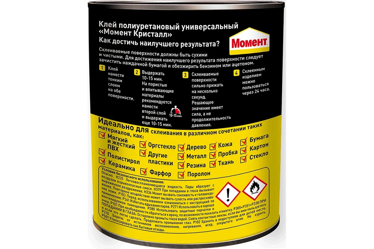 Клей Момент Кристалл упакован в удобную банку объемом 750 мл, что обеспечивает удобство использования и хранения.